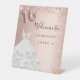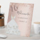 Un cartel de bienvenida para una fiesta de cumpleaños 16, 16, glamurosa y femenina. Un fondo de degradado de oro subió decorado con un purpurina falso y un vestido. Personalizar y un nombre. El número 16 se escribe con un tipo de letra de estilo globo. Atrás: sin diseño