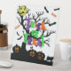 Este cartel de peatón muestra las palabras "Truco o trato" en una letra impresa única con letras violetas, verdes y naranjas con jack o laterns, murciélagos u otras calcomanías temblorosas en este tema y estilo de Halloween. Impreso con impresión digital de alta calidad y a todo color disponible en 4 tamaños de pantalla de 1/16" de poliestireno de plástico blanco de 10" x 12" con base de 3".