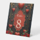 Un toque gótico, corazones y conexión eterna. El diseño presenta un diseño de fondo oscuro y elegante que llama inmediatamente la atención. Varios corazones rojos brillantes, algunos aparentemente convertidos en lágrimas, cuelgan de delicadas y delgadas cuerdas, dando a la carta un toque juguetón y romántico. El centro está dominado por un marco de diseño artístico con un interior rojo, decorado con un delicado patrón rosa que simboliza el amor y la pasión. En la parte inferior, la carta está decorada con exuberantes ramos de rosas rojas y plantas exuberantes, lo que pone de relieve el ambiente romántico.