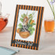 Bienvenidos a la temporada de otoño con esta caprichosa acuarela que ilustra elf de cosecha de bosques / ninfa encarnada en grandes calabazas con fondo rayado naranja y negro y una tira de texto de personalizable en la parte inferior