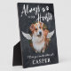 Placa conmemorativa rústica para mascotas con fondo de pizarra falsa, el título 'por siempre en nuestros corazones', huellas de patas, una foto de su querida mascota perro o gato, alas de ángel, su nombre y la frase de condolencias 'te veré al otro lado'.