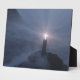 Un faro con una cruz mientras la luz brilla sobre las rocas y los rompientes de una orilla cubierta de niebla, mostrando a los barcos entrantes el camino a la seguridad.