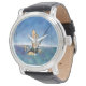 Coge este divertido reloj nuevo con un ilustracion personalizado de un pescador en una situación surrealista y extraña. El bonito agua azul y el fondo del cielo rodean este diseño para un diseño divertido y hermoso. Este divertido tema de la pesca personalizado es perfecto para los pescadores.