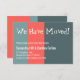 En esta divertida pieza, se usó una letra juguetona para representar las palabras "¡Nos hemos mudado!" y "¡Manténganse en contacto!" en la parte de atrás. Sus detalles aparecerán en una fuente sans-serif complementaria. He agregado bloques de color y una paleta de color gris-verde y salmón a los fondos para una diversión única. Todos los colores y tipos de letra se pueden cambiar si lo prefiere.