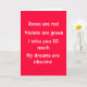La tarjeta ideal "Te echo de menos" para enviarla a la que más te pierdes. "Los Rosas son rojos, los violetas son verdes, te extraño TANTO, mis sueños son obscenos". Donamos una parte de CADA venta a la Fundación de Investigación sobre el Cáncer de Mama.