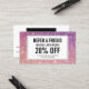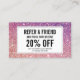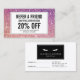 Coordina con las pestañas con la plantilla de la tarjeta de visita Purpurina púrpura/rosa antes de las 12.01 horas. Actualice el texto de promoción de su oferta deseada. Genere más ventas y visitas de sus clientes motivadores para consultar a sus amigos para un servicio con descuento o un producto gratis. Ideal para los salones de extensión de ceniza, los bares de ceniza, los maquilladores y más. © 1201AM CREATIVE