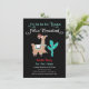 Fa la llama Feliz Navidad invitaciones de invierno con una Llama vestida para las vacaciones usando un sombrero de santa con cintas y arcos alrededor de su largo cuello, bailando alegremente al lado de un cactus de navidades. ¡Elemento que coincide con este! ¡Genial para cualquier edad! Solamente cambia la foto mostrada con tu foto ilustracion dibujado por mano por McBooboos