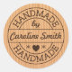 Pegatina hecho a mano con el texto "hecho a mano" en marrón diseñado como sello en un fondo de madera. Nombre del personalizable. Diseño de MheaDesign. Para cualquier consulta sobre la imagen o el diseño, por favor contáctame a través de mi página de Facebook: https://www.facebook.com/MheaDesign