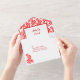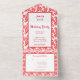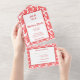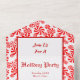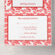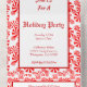 Una plantilla de invitación todo en uno editable de la fiesta de Navidad con letras de guión y letras retro y espacio para la información de tu fiesta sobre un patrón de fondo de caramelos de menta roja y blanca enmarcado en rojo.