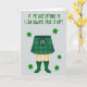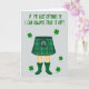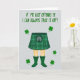 Esta tarjeta muestra un fondo gris claro con la mitad inferior de una figura centrada, vestida con un kilt de tartán verde con líneas de cuadros claras y un pequeño detalle de bolsa en la parte delantera. Las piernas desnudas se extienden hacia abajo hasta unas botas de lluvia esmeralda verde, y el emparejamiento descarado del atuendo se siente como un chiste interno que compartirías con un amigo cercano 💚. En la parte superior, la frase “¡SI MI KILT TE OFENDE, SIEMPRE PUEDO QUITÁRMELo!” está en una fuente verde gruesa y dibujada a mano que se extiende ampliamente y llama la atención. Las letras se ven ligeramente desiguales de una manera natural, como una nota rápida destinada a burlarse de alguien que te gusta sin ser malo. Pequeños tréboles de cuatro hojas están esparcidos alrededor de la figura, repitiendo los tonos verdes y añadiendo un guiño coqueto de buena suerte ☘️. La paleta se mantiene