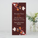 Fall hojas naranja carta de boda marrón blanco rojo, con hermosas hojas de arce rojo otoño, naranja y blanco en colores otoño y elegantes remolinos sobre fondo marrón. Una elegante y moderna invitación perfecta para una boda en otoño tradicional o contemporánea.
