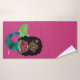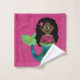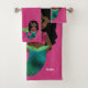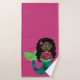 Falso sistema afroamericano personalizado de la toalla del cuarto de baño de los chicas de la sirena del negro del Relieve metalizado. Pequeña sirena adorable con la falsa cola del verde del efecto metalizado, las camisetas sin mangas rosadas magentas y las estrellas de mar rosadas en su pelo negro oscuro. Personalice con nombre en blanco en un fondo rosado brillante bonito en la toalla del cuerpo. www.SamAnnDesigns.com