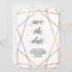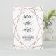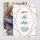Esta elegante tarjeta de ahorrar la fecha cuenta con un patrón geométrico de falso oro rosa sobre un fondo blanco, con tipografía moderna. La parte posterior contiene su foto de sangrado total superpuesta con el mismo patrón geométrico.