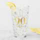 Vidrio elegante que ofrece las palabras "alegrías a 90 años" en falso efecto metalizado de oro.