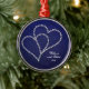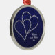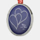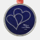 Dos corazones hechos del diamante de imitación bling del estilo - diamantes que conectan y que enlazan sobre uno a en un fondo profundo del azul real con un modelo sutil del damasco en él. Grande para las bodas, aniversario, compromiso, celebración del amor, romance, pares. Cuelgue de su árbol de navidad año tras año en honor del año dado o celebrado. Cambie el texto para adaptarse o para enviarme por correo electrónico a aquí si usted necesita ayuda con modificar para requisitos particulares o la imagen puesta sobre otros productos de Zazzle en mi tienda. ¡Si puedo… lo voy a hacer! ~:)