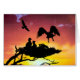 Dos chicas de águila esperan mientras un padre viene de la caza. Sus siluetas contrastan con el intenso cielo de la puesta de sol. Arte por computadora de Kathie Miller