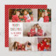 Colaje de fotos de familia limpio y moderno Tarjetas de Navidad con cinco de tus fotografías favoritas de vacaciones. Parte posterior moderna a rayas rojas y blancas para una tarjeta festiva y linda con las fotos de tus hijos. La escritura a mano roja y verde adorna la parte delantera.