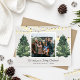 Elegante diseño de tarjeta fotográfica navideña "¡Te deseamos una Feliz Navidad!" presenta una rústica escena invernal de moda de una granja de árboles de Navidad que enmarca una foto familiar favorita. Incluye un fondo de grano de madera blanca con luces de cuerda colgantes y pinos de acuarela verde recién cortado. Personalice su elección de saludos, el apellido de su familia y el año. Dos fotos cuadradas adicionales y un mensaje personalizado adornan la parte posterior de la tarjeta.