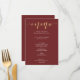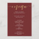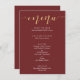 Estas tarjetas de menú Fancy Burgundy y Gold Typography le permitirán disfrutar de una elegante experiencia gastronómica. El falso Relieve metalizado dorado de la palabra "menú" se combina bien con muchos colores de fondo si se desea personalizar.