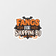 Un pegatina humorístico sobre la temática de Halloween presenta la frase "Fangs for Stopping By" en una tipografía audaz y llamativa. La palabra "Fangs" se distingue en brillantes letras de bloques naranjas, mientras que "FOR" aparece en un texto blanco limpio, y "STOPPING BY" está diseñado en letras blancas y delineadas por naranjas. Los torbellinos naranjas decorativos añaden un toque festivo. Una gran silueta de murciélago negro forma el telón de fondo, con murciélagos voladores adicionales a cada lado para un toque más espeluznante. Perfecto para las fiestas de Halloween, decoraciones para trucos o trucos, o como un divertido acento estacional para invitaciones, bolsos de regalo y materiales de marketing.