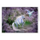 Un unicornio delicadamente matizado con lavanda predominando en un fondo de primavera floreciente de colores similares y una fantástica celebración de pájaros de la tarjeta de saludo de primavera