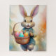Rompecabezas de un conejo alegre con un traje azul, con una canasta llena de huevos coloridos y decorados. El fondo está decorado con suaves detalles florales y colores cálidos y suaves.