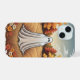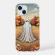 Una encantadora figura fantasmal se alza serenamente en un bosque dorado de otoño. El fantasma, envuelto en una simple sábana blanca, se mezcla con los cálidos tonos de la caída. Los árboles vibrantes y la luna llena crean un ambiente tranquilo y misterioso, con flores de otoño que le dan un toque de belleza natural.