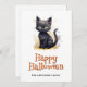 Carta feliz de Halloween con ilustraciones acuarelas de un gato negro, fantasmas y jack o’lanterns. Personaliza fácilmente esta linda tarjeta de Halloween para los niños con tu apellido y texto.