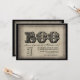 El uso de letras intrincadas explica "BOO" e invita a su invitado a unirse a usted si se atreven a un susto de Halloween. Esta invitación le da un pequeño misterio a su fiesta de Halloween. También hay productos de coincidencia.