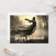 Un fantasma negro sombrío y flotante, de forma etérea, rodeado de densas nubes de niebla, que se cierne amenazantemente sobre el suelo en un paisaje oscuro e infernal con una atmósfera espeluznante. Feliz Halloween