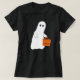 Un pequeño y adorable fantasma que sostiene un bolso de truco o de regalo hace una camiseta de Halloween muy linda. Perfecto en una camisa negra o marina.