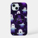 Un patrón hipnotizante con adorables fantasmas brillantes en tonos morados y blancos, flotando sobre un oscuro fondo nocturno. El brillo etéreo añade un toque mágico, perfecto para capturar el espíritu lúdico de Halloween.