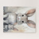 Rompecabezas de dos adorables conejos, uno grande y otro pequeño, sentados uno al lado del otro con expresiones alegres en medio de un fondo suave y natural. Los colores suaves y el delicado follaje que los rodea crean un ambiente sereno y acogedor.
