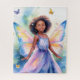 Rompecabezas de un niño alegre con coloridas alas de mariposa parado en un vestido púrpura, rodeado de mariposas y colores suaves y soñadores. La escena transmite un sentido de magia y capricho en un entorno vibrante inspirado en la naturaleza.