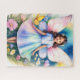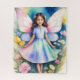 Rompecabezas de un joven chica con alas de hadas en medio de un vibrante jardín lleno de flores de colores y mariposas. Su vestido combina tonos pastel y realza el ambiente mágico y caprichoso de la escena.