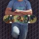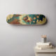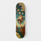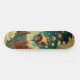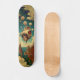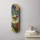 Fantasy anime wall art skateboard. A girl in a space helmet with lots of balloons on her head floating above the ocean, houses and buildings flying around in the background, 2D flat illustration, high resolution, sharp details, vivid colors, fantasy, surrealism, dreamy atmosphere, beautiful composition, hyper detailed, intricate details, high definition, sharp focus, cinematic, beautiful composition