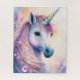 El rompecabezas de un majestuoso unicornio con un cuerno brillante y colorido se representa en medio de un marco de ensueño de suaves colores pastel. Su flor está adornada con delicadas flores, lo que crea una escena etérea y encantadora.
