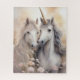 Rompecabezas de dos unicornios que se unen estrechamente en un campo de ensueño lleno de flores suaves de color pastel. Sus caudales atraen la luz de una suave puesta de sol, destacando su majestuosa presencia.