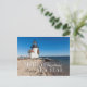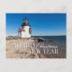 Faro en la playa con una corona de Navidad