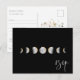 Fases de luna de acuarela dorada, tarjeta postal de RSVP de boda con solicitud de canción. La tarjeta cuenta con ilustración de fases lunares sobre fondo negro, gráfico de letra "RSVP" blanca, marco de dirección de flores silvestres en la parte posterior y varias líneas para su información de RSVP personalizada.