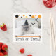 El diseño presenta un gatito gris esponjoso y espeluznante vestido con el gorra de una bruja negra con murciélagos de Halloween volando por ahí. La servilleta tiene acentos negros, naranjas, amarillos y grises y dice Trick o Treat en la parte inferior en un guión simple negro.