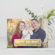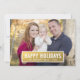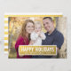 Tarjeta fotográfica de vacaciones moderna con texto en negrita en blanco sobre una etiqueta de Relieve metalizado dorado (efecto fotográfico impreso). Diseño de plantilla versátil ELKE CLARKE© Versatile. Añade tu foto, tu nombre y año. En una fuente de texto retro. Enviar a la familia y amigos para las vacaciones. Patrón de rayas doradas y blancas en la espalda. Hay otros colores disponibles. "Felices Fiestas"