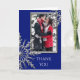 Personalizar del elegante Faux Silver Snowflake en Blue Gracias Nota Tarjeta fotográfica dentro y fuera. Añade tu foto al exterior y también añade tu propia nota personal de agradecimiento, aprecio y gratitud dentro. Adecuado para usar para regalos recibidos en Navidades o cumpleaños de invierno, ducha de novia, fiesta de compromiso o boda. Este elegante y festivo copo de nieve personalizado de agradecimiento nota fotográfica presenta intrincados copos de nieve de color plateado adornando las esquinas con un rico fondo azul.