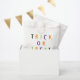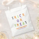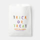 Truco o vístete la tipografía espeluznante y colorida Halloween divertido fiesta personalizada de Halloween bolsos de favores. Tipografía naranja, verde, púrpura, blanca y colorida, fondo negro. Texto del personalizable y nombre de la familia en la parte inferior de la bolsa.