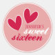 Happy Hearts Sweet Dieciséis pegatinas redondos presentan dos corazones rosados en un fondo rosado diagonalmente rayado. © Morning 6