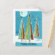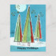 Tarjeta de felicitación Happy Holidays con tres árboles de diseño moderno en la nieve de mediados de siglo con diseños atómicos estrella en el cielo flotando alrededor de la luna llena sobre un brillante fondo de agua azul.