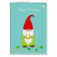 Cute Happy Gnome con Horseshoe, Confeti dorado y Fourleaf clovers Happy Holidays Card. El texto se puede personalizar.