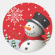 El muñeco de nieve lleva puesto un gorra negro y una bufanda roja. El fondo tiene árboles cubiertos de nieve y copos de nieve en el fondo rojo. Este es un ilustracion digital.