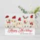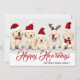 Este diseño navideño presenta una foto de cinco cachorros de Golden Retriever que llevan sombreros rojos de Navidad y el texto "Feliz Howlidays" escrito en tipografía roja popular con un apellido agregado debajo. La parte trasera de la tarjeta se ha dejado en blanco para que agregues tu mensaje. Para personalizar, puedes agregar tu propia foto y editar el texto.