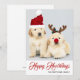 Este diseño navideño presenta una foto de dos cachorros de Golden Retriever que llevan sombreros rojos de Navidad y el texto "Feliz Howlidays" escrito en tipografía roja popular con un apellido de familia añadido debajo. La parte trasera de la tarjeta se ha dejado en blanco para que agregues tu mensaje. Para personalizar, puedes agregar tu propia foto y editar el texto.